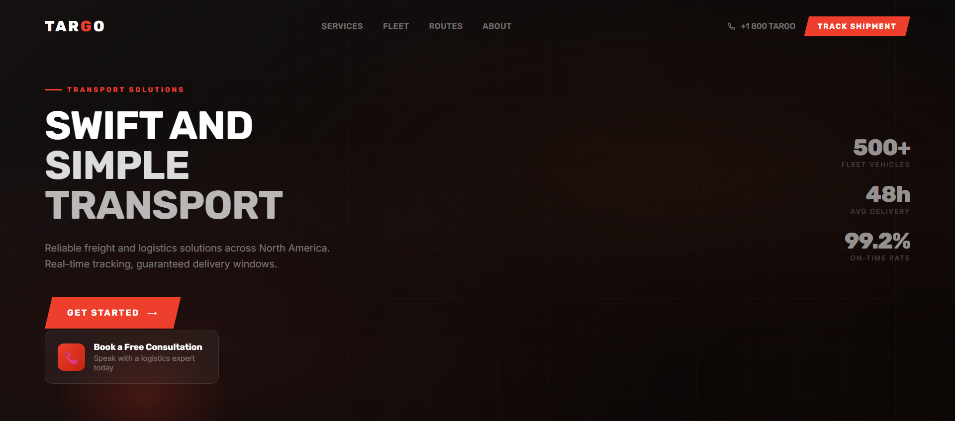 Design and build a dark-themed hero section for a logistics brand. React + Tailwind CSS.